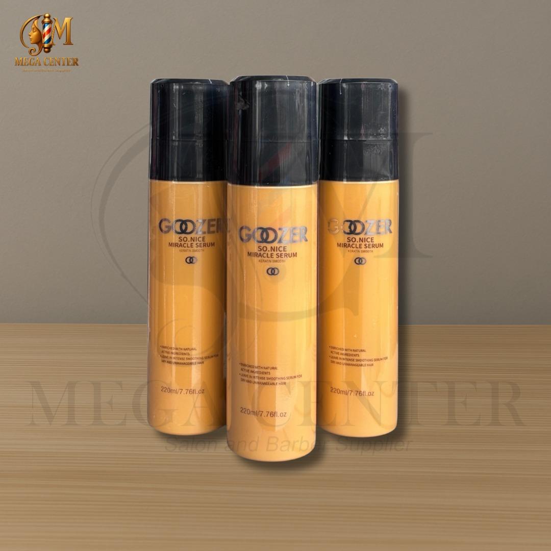 Goozer miracle serum keratin smooth adalah serum perawatan rambut berbentuk spray untuk perlindungan perbaikan mendalam pada rambut formul yang kaya bahan aktif memperbaiki batang rambut yang rusak akibat proses kimia ,catokan atau blow .mengandung argan oil dan hazelnut oil yang dapat mengembalikan kelembaban rambut dan menutrisis kulit kepala mengandung keratin smooth sehingga rambut yang susah di sisir jadi lebih gampang di sisir rambut jadi lebih halus dan lembut .
